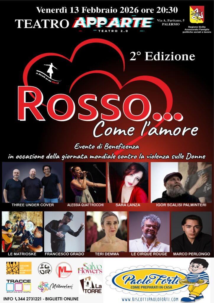 Venerdì 13 febbraio, alle ore 20:30, il Teatro Apparte di Palermo ospiterà la seconda edizione di “Rosso come l’amore”, l’evento di beneficenza ideato e organizzato da Io Barcollo ma non MOLLO!®, realtà da anni impegnata nella sensibilizzazione contro la violenza di genere e nel sostegno concreto alle donne.
