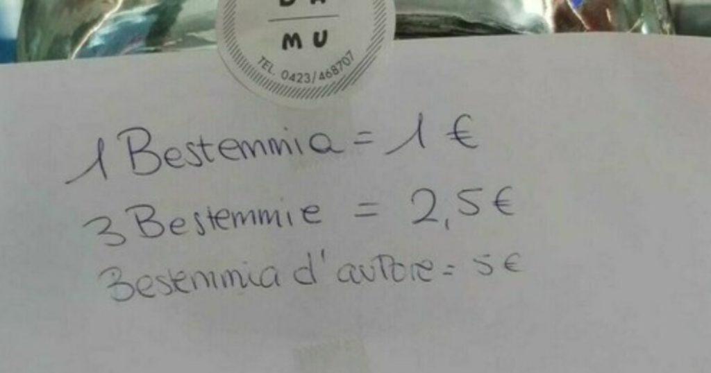 A Castello di Godego (Treviso), il Bar Sport, fa pagare le bestemmie. Come riporta Il Gazzettino, infatti, i gestori – Daniele, Michela e la loro figlia Camilla – hanno esibito sul bancone un cartello (posizionato su un barattolo di vetro) con i relativi listini: “1 bestemmia 1 euro; 3 bestemmie 2,5 euro; bestemmia d’autore 5 euro”.