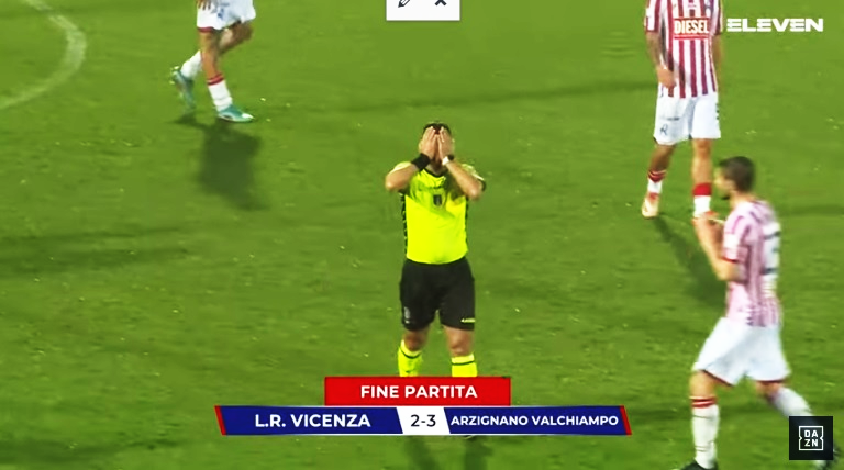 Serie C, a Vicenza arbitro palermitano sbaglia clamorosamente e si dispera – VIDEO