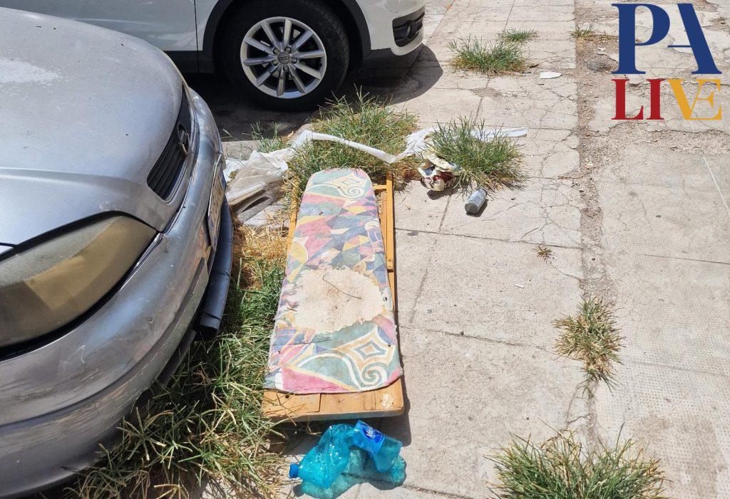 Un salotto che offre erbacce e rifiuti su un marciapiede malmesso, dove per un anziano o per un giovane distratto non sarebbe difficile anche inciampare. Tra bottiglie di plastica o di vetro, fa la sua comparsa persino un asse da stiro in legno. Forse qualcuno avrà voluto disfarsene in preda al caldo torrido: che gli abbia anche fatto perdere il senso della civiltà?