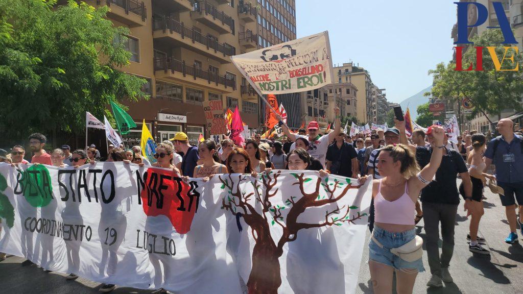 Nel giorno del 31esimo anniversario dalla Strage di via D’Amelio, si svolge a Palermo il corteo “Basta Stato Mafia”. Una marcia che dall’Alberto Falcone di via Notarbartolo si snoda sino al luogo nel quale persero la vita, il 19 luglio 1992, il giudice Paolo Borsellino e gli agenti della scorta Agostino Catalano, Walter Eddie Cosina, Vincenzo Li Muli, Claudio Traina ed Emanuela Loi.