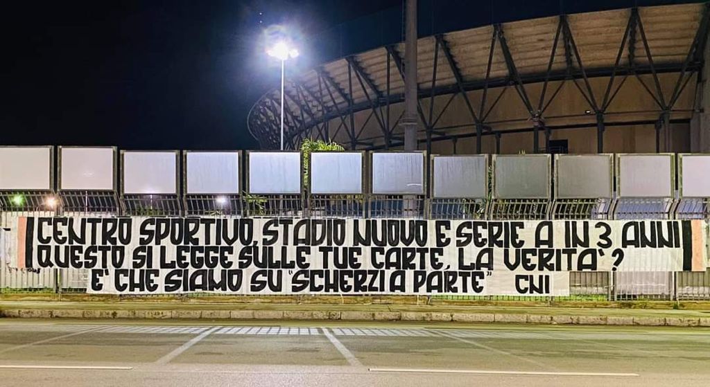 La Curva Nord Inferiore ha appeso sui cancelli dello stadio Renzo Barbera uno striscione con scritto: “Centro Sportivo, Stadio nuovo e Serie A in 3 anni? Questo si legge sulle carte. La verità? E’ che siamo su scherzi a parte”. Un messaggio polemico nei confronti della società del Palermo che non sta rispettando le aspettative di inizio stagione.