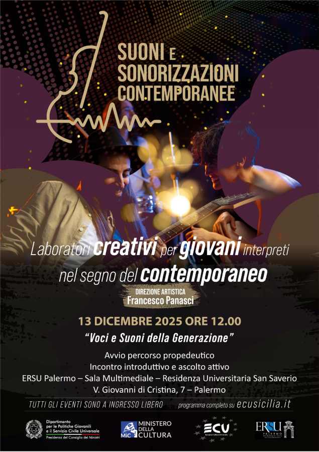 Suoni e Sonorizzazioni Contemporanee – Laboratori creativi per giovani interpreti nel segno del contemporaneo è un progetto culturale e sociale promosso dall’Associazione E.C.U. – European Culture University, in collaborazione con Panastudio Productions, con la direzione artistica di Francesco Panasci, sostenuto da ERSU Palermo e con la compartecipazione del Ministero per lo Sport e i Giovani – Dipartimento per le Politiche Giovanili e il Servizio Civile Universale – Presidenza del Consiglio dei Ministri.