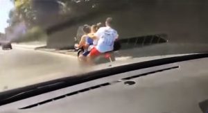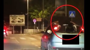 Un giovane aggrappato al tettuccio di un auto che corre a 130km/h, mentre è ripreso con il cellullare da un'altra...