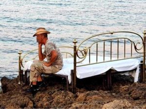 È diventato virale lo scatto che immortala un uomo seduto su un letto, con tanto di lenzuola e materasso, tra...