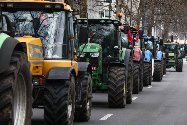 epa10500476 Farmers from the northern region of Flanders take part in a protest with their tractors against a new regional government plan to limit nitrogen emissions, in Brussels, Belgium, 03 March 2023. EPA/STEPHANIE LECOCQ