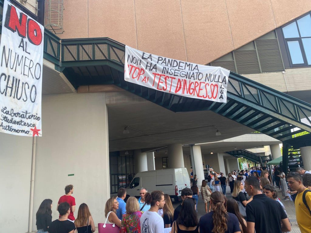 “La pandemia non ha insegnato nulla. Stop ai test d’ingresso”: È questa la scritta su uno degli striscioni appesi questa mattina di fronte l’Edificio 19 di viale delle Scienze.