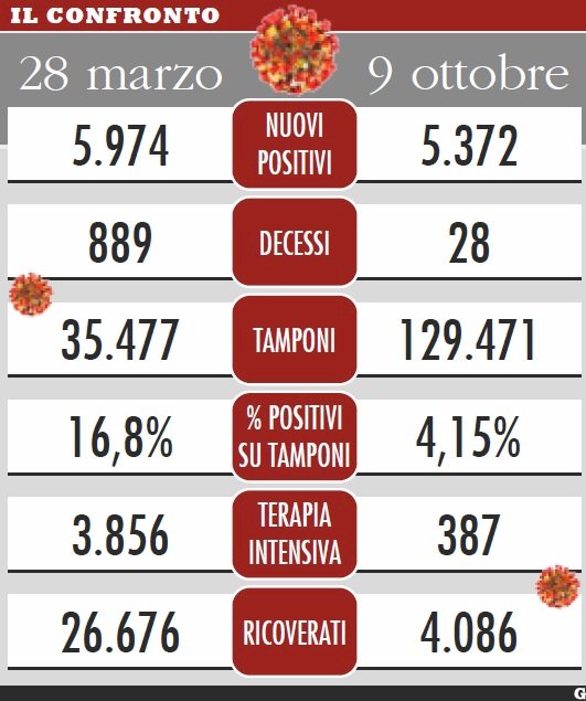 Negli ultimi giorni il Covid sta accelerando, e i numeri dei contagi crescono a ritmo sostenuto. Spesso i commentatori fanno confronti fra il numero dei contagiati attuali e quelli che si registravano a marzo, nel bel mezzo del lockdown. Per fortuna di simile c’è solo il numero dei positivi, perché il quadro della situazione attuale è molto diverso da quello che c’era, purtroppo, in quei giorni. Lo dicono i numeri di ieri confrontati con il 28 marzo. È vero, in entrambi i casi i contagiati hanno superato i 5mila casi, ma sono diversi però tutti gli altri parametri. I pazienti ricoverati, quelli finiti in terapia intensiva, il numero dei tamponi eseguiti e infine i decessi. L’incidenza sui tamponi oggi è quattro volte inferiore rispetto a fine marzo, i decessi sono 30 volte inferiori ed i ricoverati in terapia intensiva sono un decimo di allora .